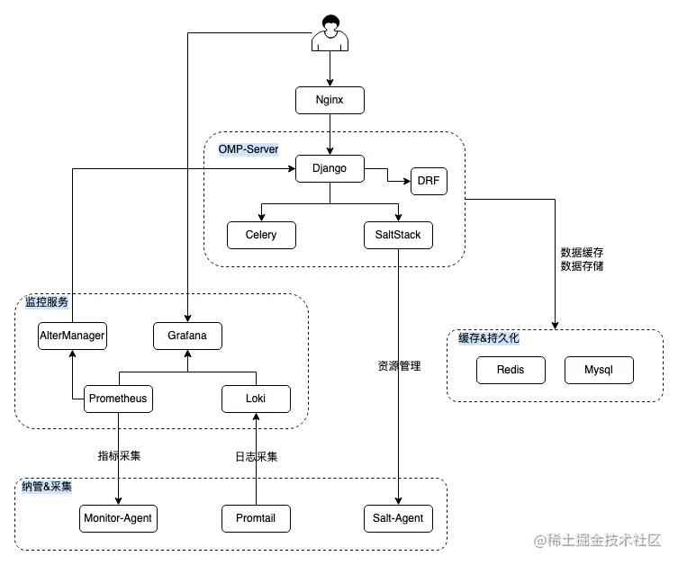 如下面OMP架构图所示,OMP前端基于Ant Design设计的React框架,后端使用Django框架,集成SaltStack等组件,实现基础功能。Agent端通过saltstack agent端实现对服务的安装管控,并自研monitor agent实现对数据的指标采集。