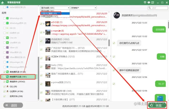 第二步、扫描完毕,左侧寻找并点击【微信聊天记录】,为了节约时间,可以在上方选择‘只显示已删除’,红色的聊天记录为删除的部分。选好需要恢复的部分,在点击【恢 复】等待恢复即可。