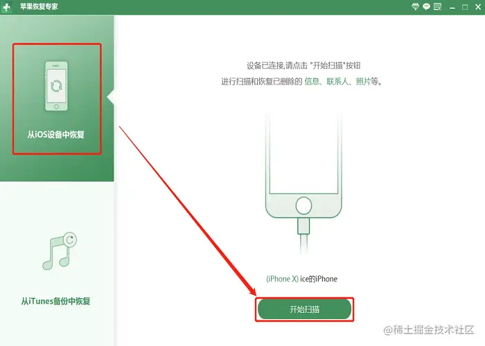 第一步、电脑与手机连接好后,运行数据蛙苹果恢复专家,选择【从iOS设备中恢复】,之后点击下方的【开始扫描】。