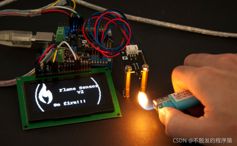 运行程序,将打火机慢慢靠近火焰传感器,看看蜂鸣器会不会报警。