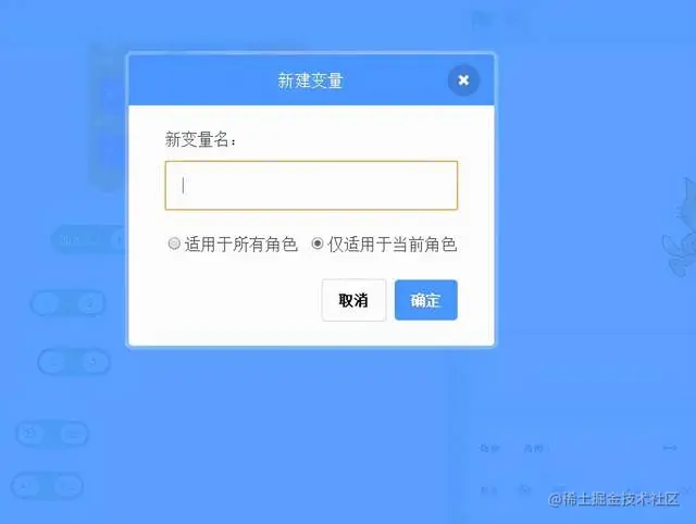 这个可以说是一门编程语言必备的东西了,Scratch也是,有了它,你可以做很多事情并实现它们。我们点击变量模块并点击建立一个变量,如图: