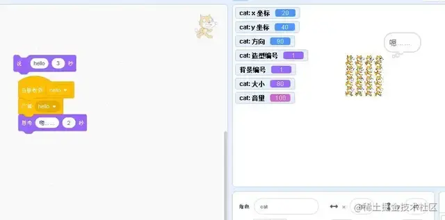 这里小编设置了按下“a”键发出猫咪叫,按下"b"键角色马赛克特效增加25,小编刚按下“b”键就出现了马赛克效果,可见小编的做法是正确的。然后我们还可以看到这个事件可以接收到消息,并进行一些处理,比如说:
