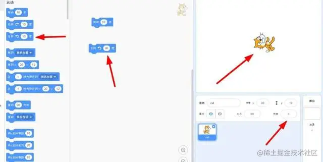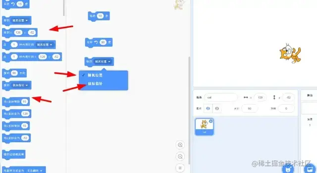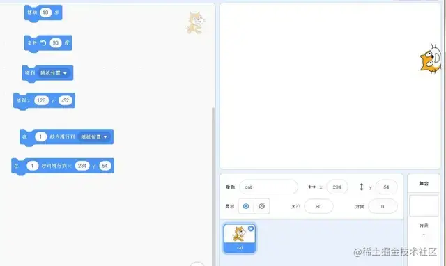可以看到,我们拖动左转后可以设置左转的角度,然后点击之后角色就开始旋转一定角度,就好比移动了一样。然后我们还可以移动角色,这里可以选择移动到随机位置或者鼠标指针位置,这里我选择了随机位置,如图: