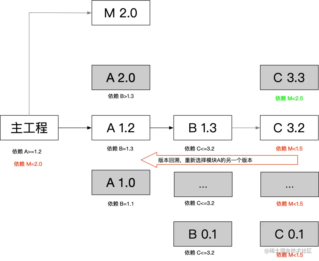 根据下图所示,当子节点C出现依赖冲突时,Molinillo会回溯到它的父节点B,重新选择父结点B的另一个版本,然后重新遍历它的子节点。如果父结点有许多子节点,深度遍历其他子节点也带来M倍耗时,M是深度遍历B子节点经过的所有节点数量。 父节点B的新版本可能声明了子节点C新的约束条件,这样就解决了子节点C的依赖冲突问题。