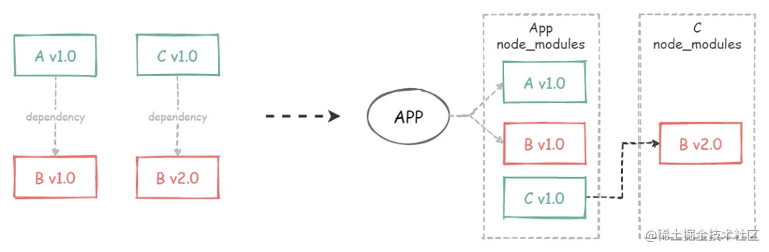 前端常用的包管理工具是npm,前端开发从来不会遇到包冲突的问题。npm利用语言特性实现依赖包隔离,这是一种冗余换取稳定的策略。当npm工程里出现传递依赖冲突时,各个节点会保留自己依赖的版本。这种策略可以避免依赖仲裁的冲突错误,运行时稳定性也高。但它会导致依赖地狱,包大小也会膨胀。