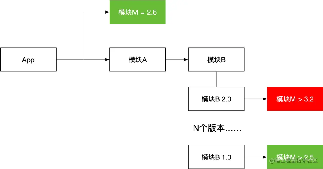 正如上文所分析的仲裁变慢案例,遍历过程中,Molinillo会构建一个 版本组合(a 1.0,b1.1,.....)。在依赖图的不同结点里,如果出现了两个相悖的依赖约束(a > 2.2,a = 1.8),就会产生依赖冲突。