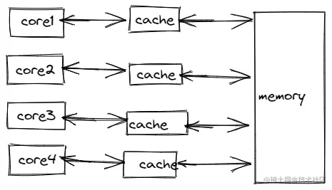 我们一般是先从操作系统的内存中读取数据到cpu中,cpu修改数据完成后,把数据再刷回到内存中去;然而因为cpu非常快,内存虽然也快,但是完全没有cpu快,为了弥补这种差距,操作系统在cpu核内存间加了一层缓存,比如我们所知道的L1、L2、L3 cache。