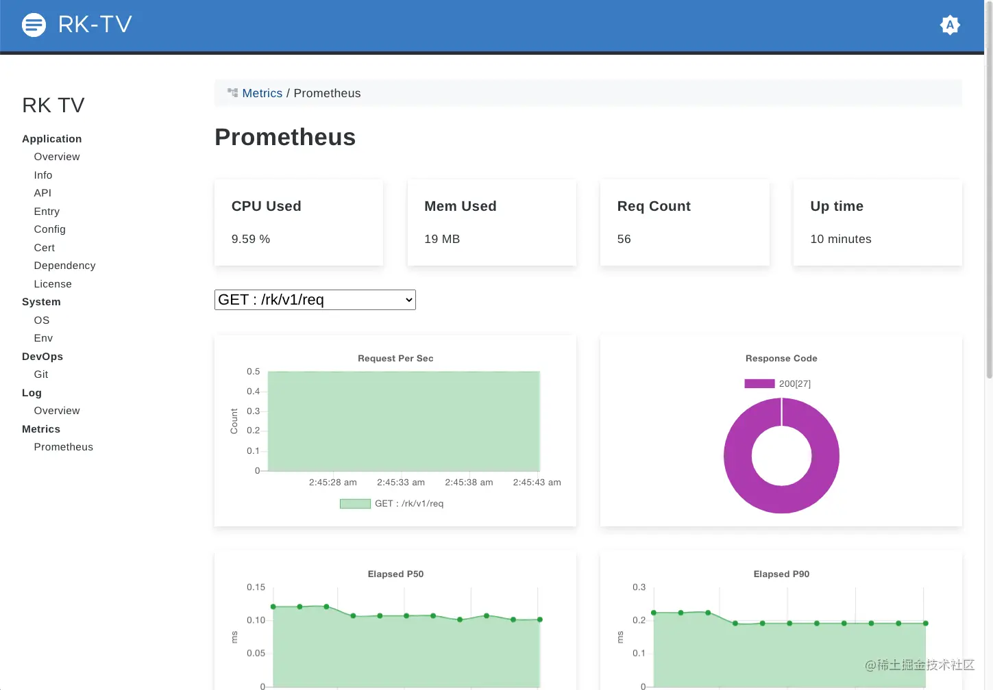 rk-boot 如果开启了 Prometheus 中间件,我们可以在这个页面中看到 API 的基本监控信息。