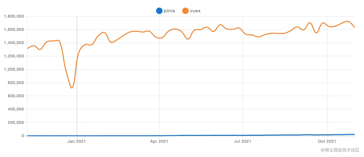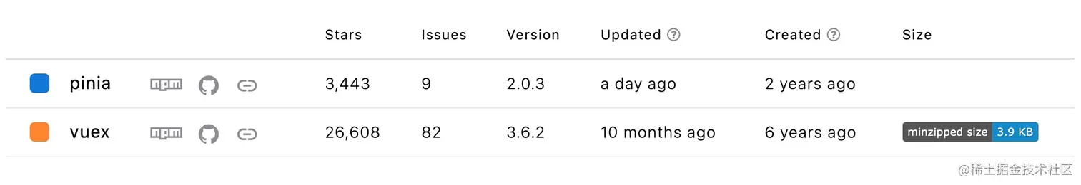 Pinia 作为后起之秀,不管是 Stack Overflow 上的问题解决方案还是下载量上,肯定都不如 Vue 核心团队推荐的 Vuex。其他方面的对比可以直接阅读 pinia-vs-vuex ,这篇文章非常详细地比较了二者。言而总之:小项目可以试水 Pinia,大项目还是用成熟的 Vuex。(另外,外链的对比时间比较早,目前 Pinia 好像是支持了时间旅行功能)