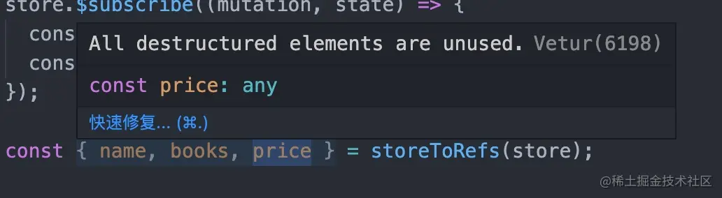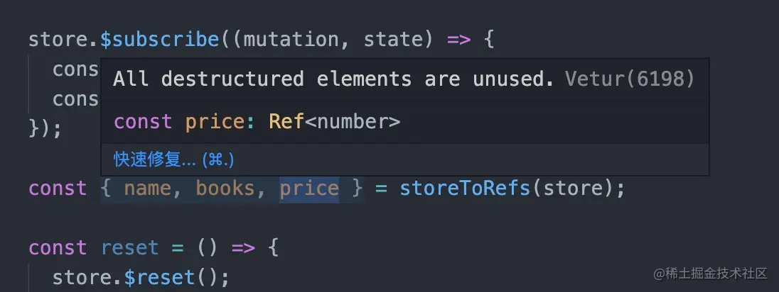 最终被 App 组件消费。⚠️ 直接解构 store 会使其失去响应式,为了在保持其响应式的同时从 store 中提取属性要使用 storeToRefs ,如下述代码所示: