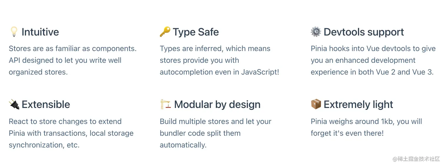 stores并实现自动地代码拆分; - 极其轻量(1kb),甚至感觉不到它的存在 ;