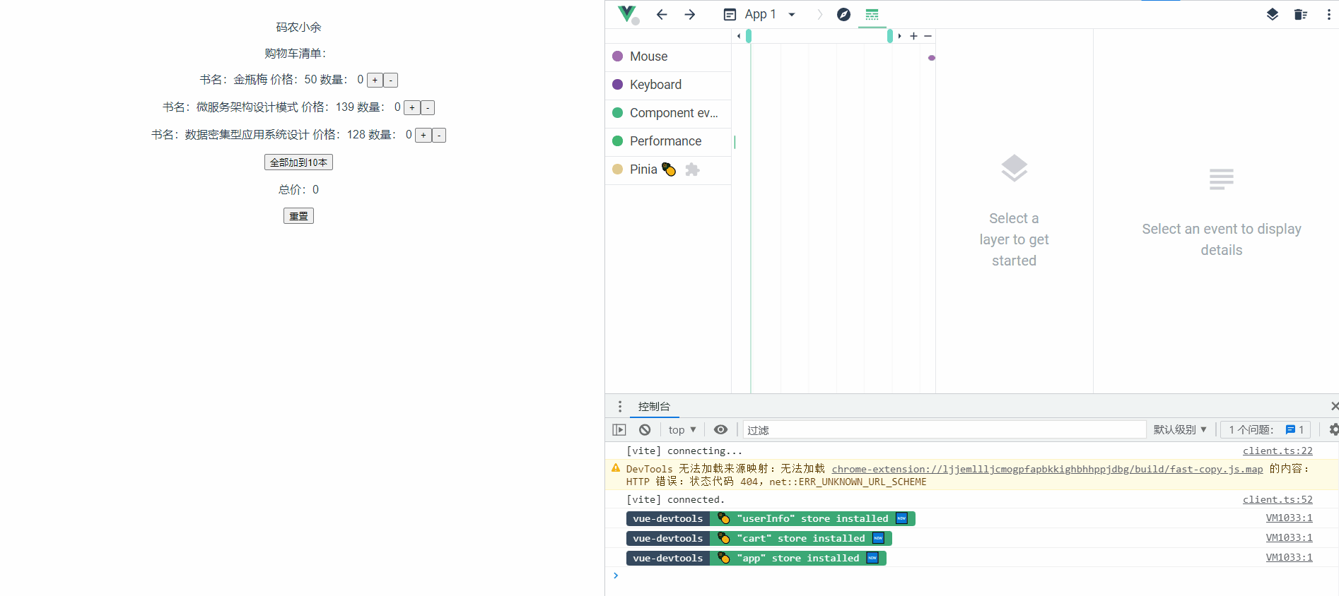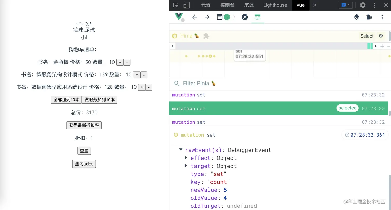 本文详细地介绍了 Pinia 的基础使用,从 state、Getters、Actions 到 Plugins,都有例子辅助学习。Pinia 的特性也都在文中有涉及,比如composable store、TypeScript 的支持,devtool 插件的集成如下图所示: