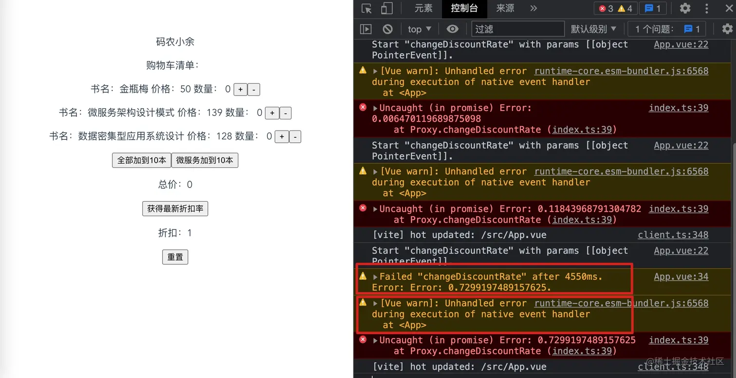 上述代码会以 rejected 的状态结束 promise,$onAction 能够执行到 onError 钩子,这个钩子是跟 vue3 的 errorHandler 挂钩,想知道这部分怎么实现滴可以三连持续关注最新内容哦,下篇文章将会从 pinia 源码角度分析。最后执行效果如下图所示: