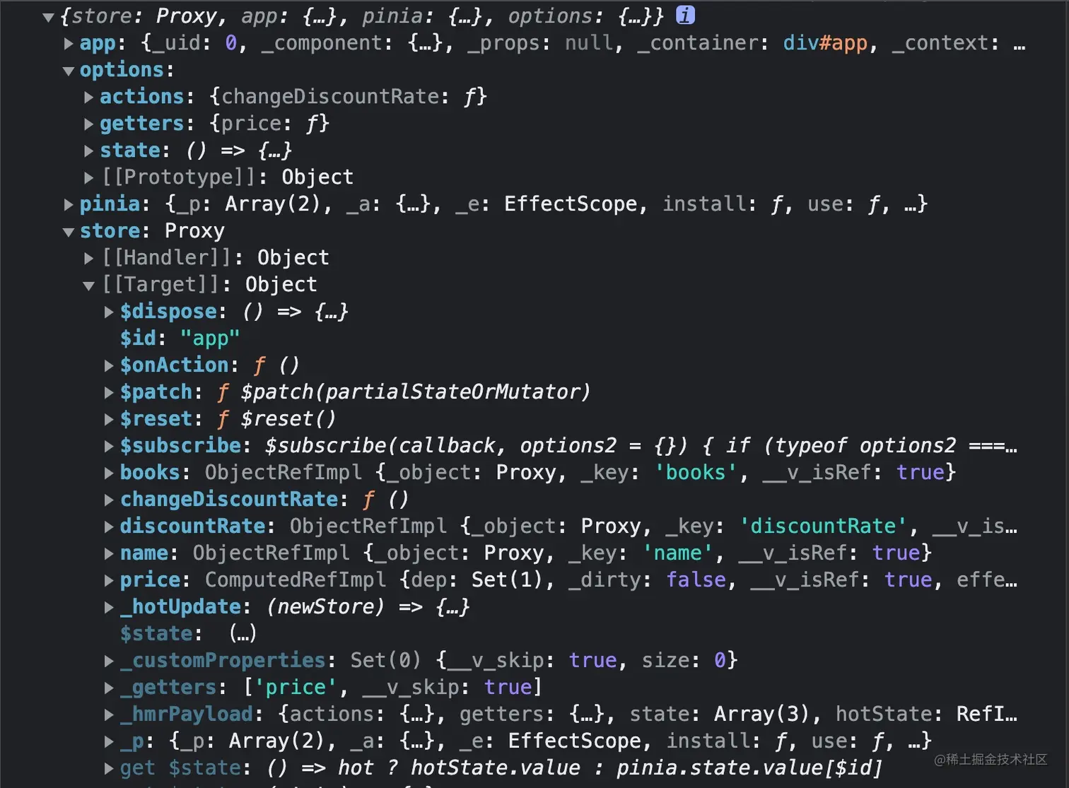 我们可以从 context 中拿到从 createApp() 中创建的 app 实例、defineStore 中的配置、从 createPinia() 中创建的 pinia 实例、当前 store 对象。有了这些信息,你要完成上述那些扩展无非只是基于 context 去发挥。 下面列对两个比较常见的用法举例说明。