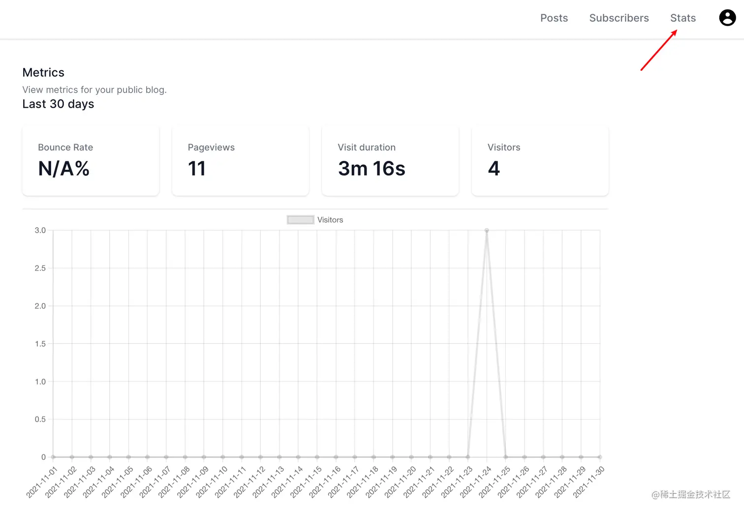 Papyrus 还为你提供了一个 30 天访客统计的功能,以图表的形式展现最近 30 天的页面访问量以及访客数量。