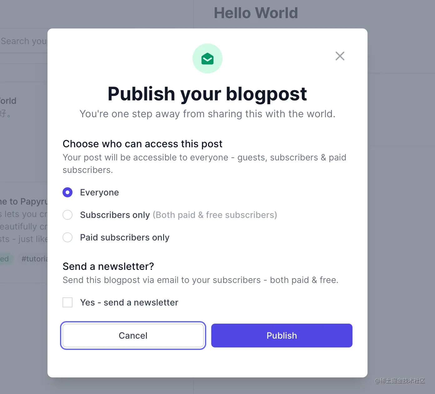 还可以设置发表文章的同时,将文章变成一个 newsletter 发送到订阅者的邮箱。