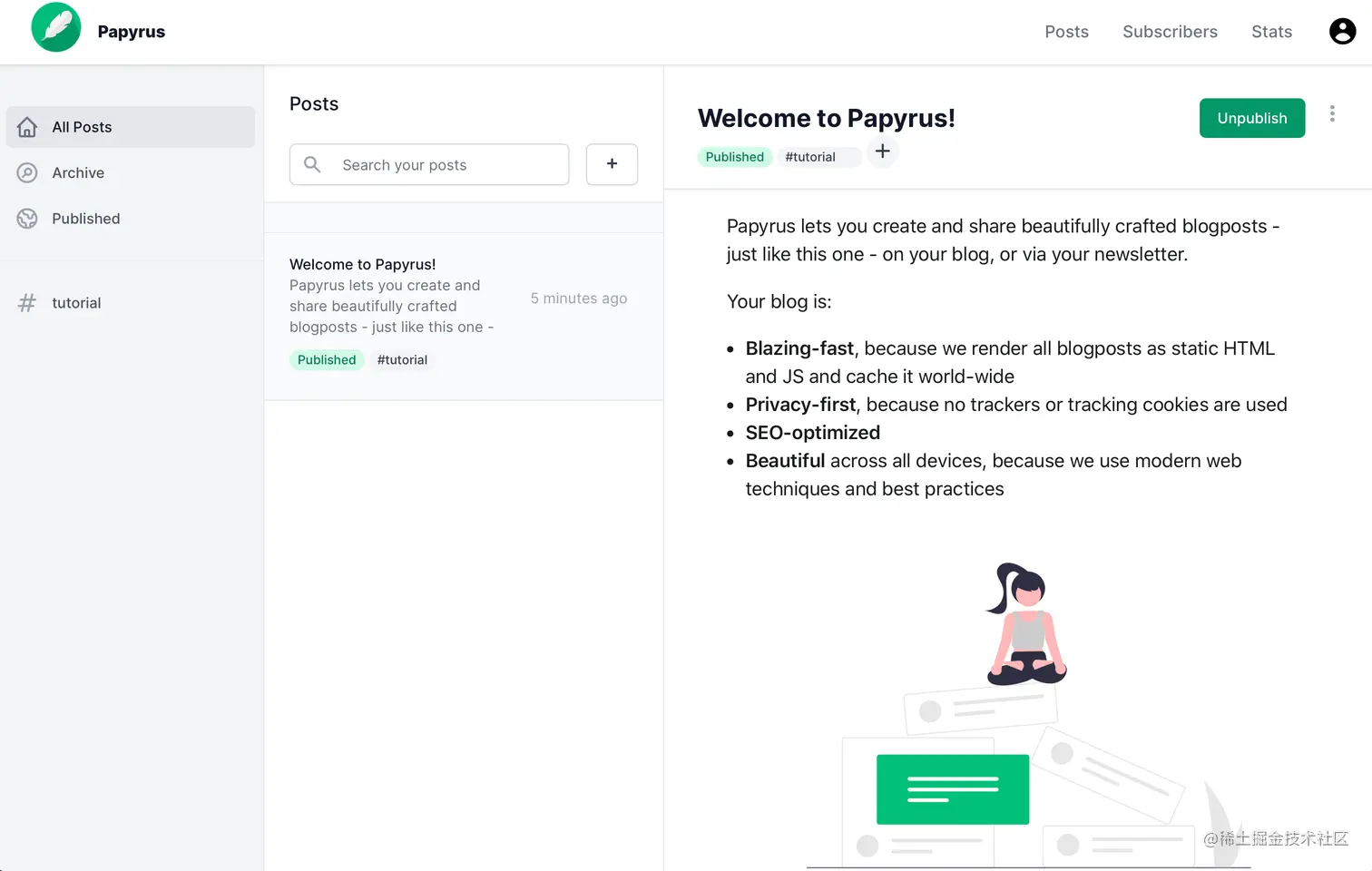 言归正传,说了这么多其实都是想介绍我最近逛 Product Hunt 发现的”神奇宝贝“,Papyrus,一个可以让你免费写博客 / 获取观众订阅 和获得收入的平台。