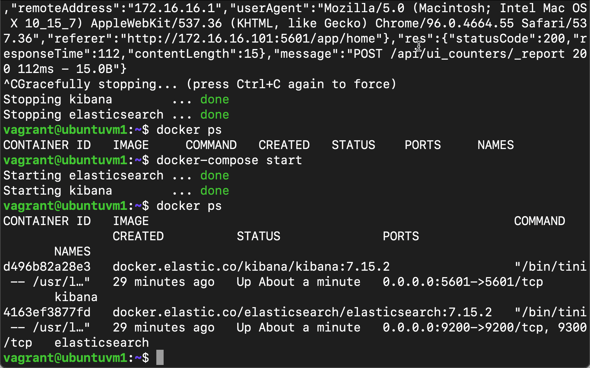我们可以看到没有任何运行的 container。我们可以使用如下的命令来重新启动 Elasticsearch 及 Kibana: