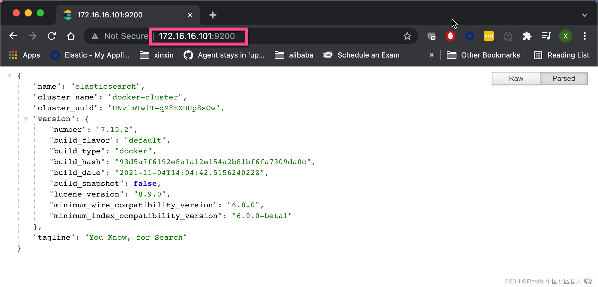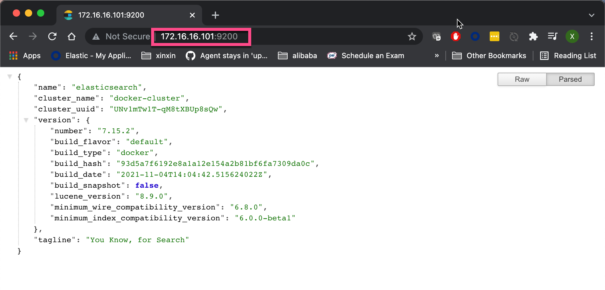 也即,它可以在 localhost 被访问。当让我们也可以在浏览器中输入如下的地址 http://172.16.16.101:9200/: