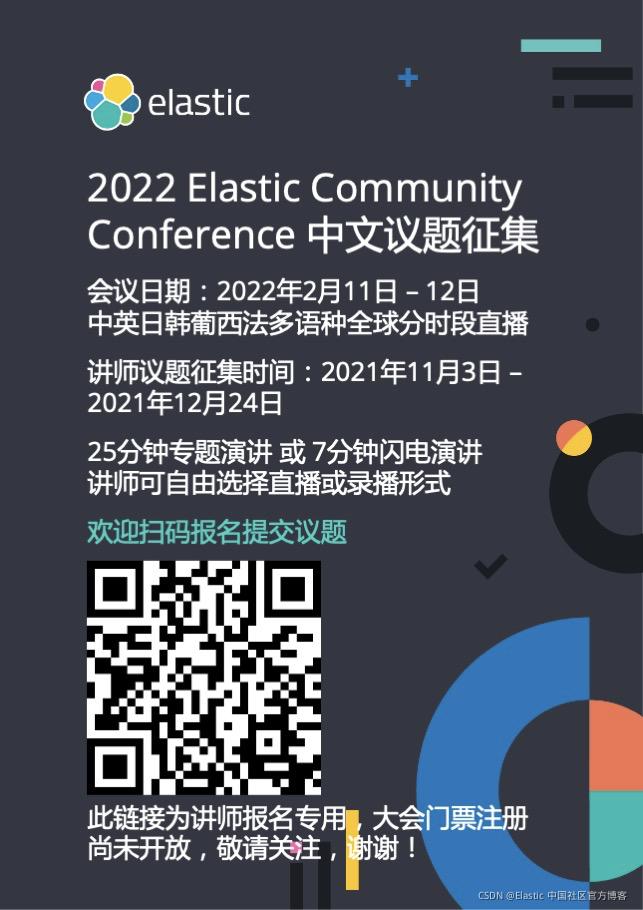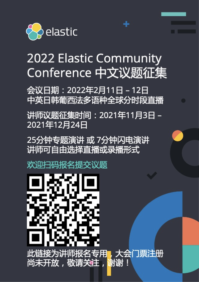 大家好,2022 年 Elastic Community Conference 议题征集开始啦!会议日期为 2022 年 2月 11日 至 12日,议题征集截止到 2021 年 12 月 24 日,语种包括中英日韩葡西法,中文演讲时段为 2 月 12 日上午,讲师可以自由选择直播或者录播。欢迎扫码报名,谢谢!ela.st/apj