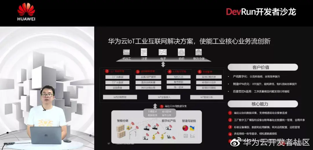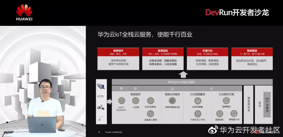 华为云IoT致力于“智简联接”,以可信的端到端安全为基础,提供芯、端、边、云全栈全场景物联网云服务,使能千行百业。比如在“端”侧,可提供LiteOS、HarmonyOS等轻量级操作系统,内置可连接华为云IoT的SDK,实现设备接入的极简化;在“边”缘侧,可提供IoT边缘的云服务,实现设备边缘的快速接入,还可提供业务管理能力,将行业应用集成进来,解决业务资质审核的诉求;在“云”端,华为云IoT的功能则更为强大,如数据分析服务、行业使能服务以及智能制造、智慧园区、路网数字化之类的行业解决方案等等。