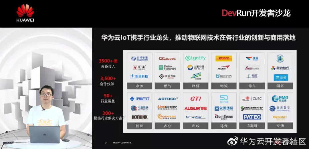 据介绍,华为云IoT正在携手各行业龙头企业,推动物联网技术在各行各业中创新与商用落地。其中,设备接入3500+类,合作伙伴3500+个,覆盖行业50+个,精品行业解决方案300+个。