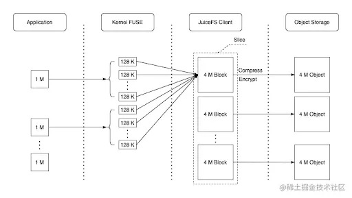 以一次简单的 JuiceFS 基准测试为例,其第一阶段是使用 1 MiB IO 顺序写 1 GiB 文件,数据在各个组件中的形式如下图所示:
