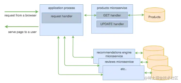 当用户的请求来自浏览器时,它将由 Web 应用程序(Linux 或 Windows 进程)提供服务。通常,被调用的应用程序代码片段称为请求处理程序。处理程序内部的逻辑将依次多次调用数据库,获取呈现页面所需的信息并将其拼接在一起,然后呈现返回给用户的网页。很简单吧?事实上,许多 Ruby on Rails 书籍都有类似这样的教程和示例。那么,你可能会问,为什么要把事情复杂化?