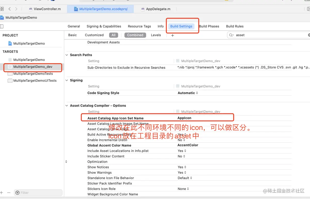 7、不同的target配置不同的icon标志:在工程中Assets.xcassets,添加相应的icon图片,通过设置的名称给AppIcon命名
