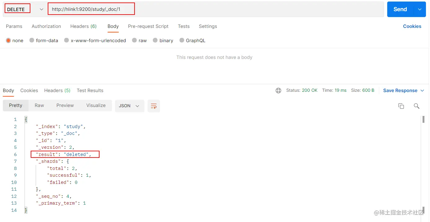 删除一个文档不会立即从磁盘上移除,它只是被标记成已删除(逻辑删除) Postman 向服务器发送 delete 请求