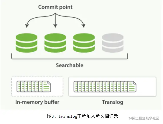 每次写入新文档时,都会先写入 内存 中,并将这一操作写入一个 translog 文件(transaction log)中,此时如果执行搜索操作,这个新文档还不能被索引到。
