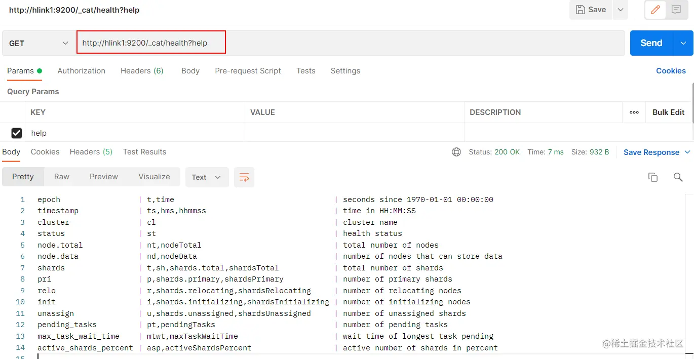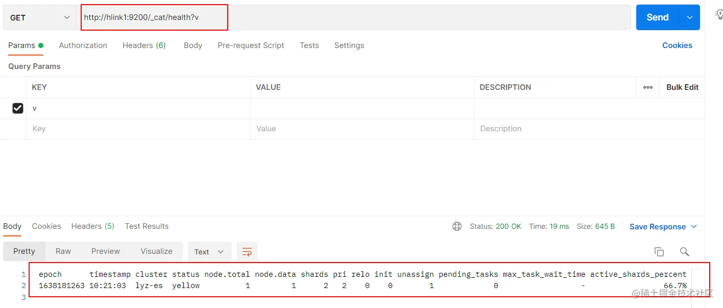 - cluster:集群名,是在 ES 的配置文件中配置的 cluster.name 的值。