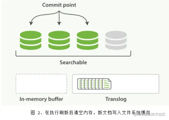ES 会每隔 1 秒时间(这个时间可以修改)进行一次刷新操作(refresh),此时在这 1 秒时间内写入内存的新文档都会被写入一个文件系统缓存(filesystem cache)中,并构成一个分段(segment)。此时这个 segment 里的文档可以被搜索到,但是尚未写入硬盘,即如果此时发生断电,则这些文档可能会丢失。