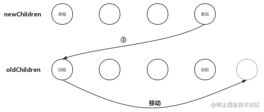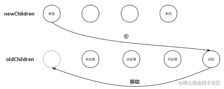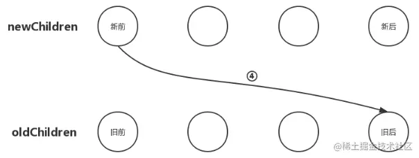 3、把newChildren数组里所有未处理子节点的最后一个子节点和oldChildren数组里所有未处理子节点的第一个子节点做比对,如果相同,那就直接进入更新节点的操作,更新完后再将oldChildren数组里的该节点移动到与newChildren数组里节点相同的位置;