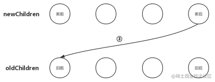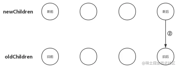 2、把newChildren数组里所有未处理子节点的最后一个子节点和oldChildren数组里所有未处理子节点的最后一个子节点做比对,如果相同,那就直接进入更新节点的操作并且由于新后与旧后两个节点的位置也相同,无需进行节点移动操作;如果不同,继续往后尝试。