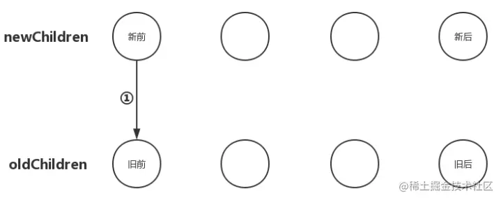 1、把newChildren数组里的所有未处理子节点的第一个子节点和oldChildren数组里所有未处理子节点的第一个子节点做比对,如果相同,那好极了,直接进入之前文章中说的更新节点的操作并且由于新前与旧前两个节点的位置也相同,无需进行节点移动操作;如果不同,没关系,再尝试后面三种情况。