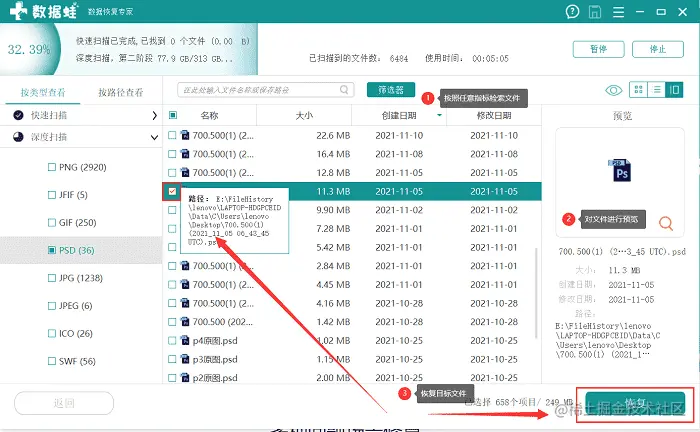 步骤二:软件进入快速扫描后,软件会扫描出一些移动硬盘丢失的数据文件,你可以在筛选器旁的文本框输入文件名称进行检索,勾选目标文件对文件进行预览,以此来确定想要恢复的目标文件。