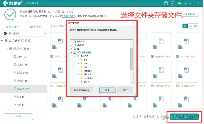 步骤三:完成深度扫描和对文件的预览后,点击窗口的下方就能进行数据的恢复了。在这里要注意不能将数据恢复在原来的数据硬盘中,会导致数据恢复的失败,你在这里可以将数据恢复在电脑的硬盘中,也可以存储在常用的磁盘,方便日常的文件管理和操作。