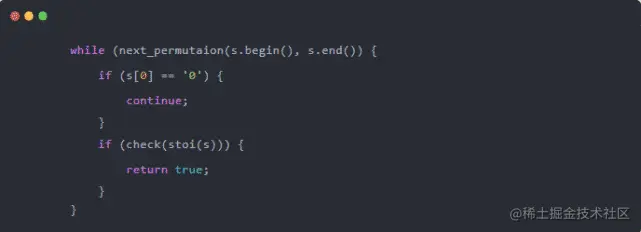 而有些时候,第一次的执行逻辑我们不需要满足循环条件,也要执行。这时候就可以用do ... while。举个例子,前几天的LeetCode每日一题869. 重新排序得到2的幂,刚好遇到这么一个场景: