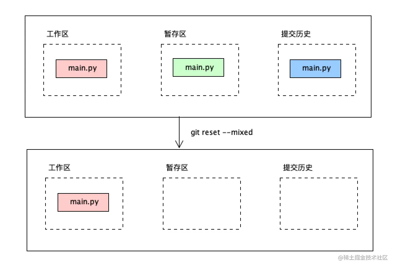 1、更新HEAD指向dde4ac13ab0f41ba0575be2de44f4368c6ebd280提交 ,重置提交历史和暂存区的过程是soft和mixed相同