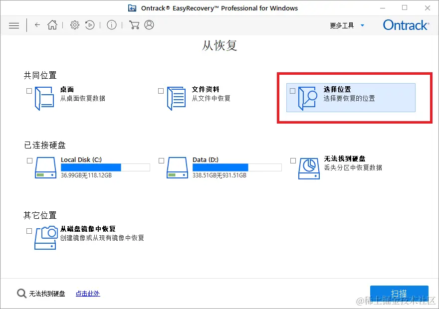 接着,EasyRecovery会让你选择位置,可以从桌面,从文件资料,或者从其他盘。小编点击“选择位置”,在选择位置里找到自己的文件夹。