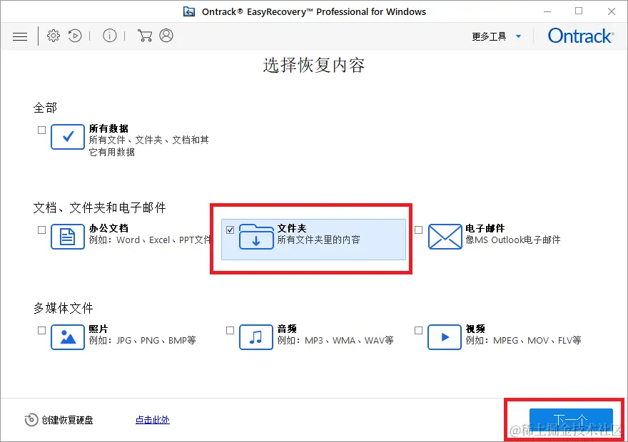 打开EasyRecovery,把默认勾选的“所有数据”取消掉,然后勾选“文件夹”,点击下方的“下一个”。