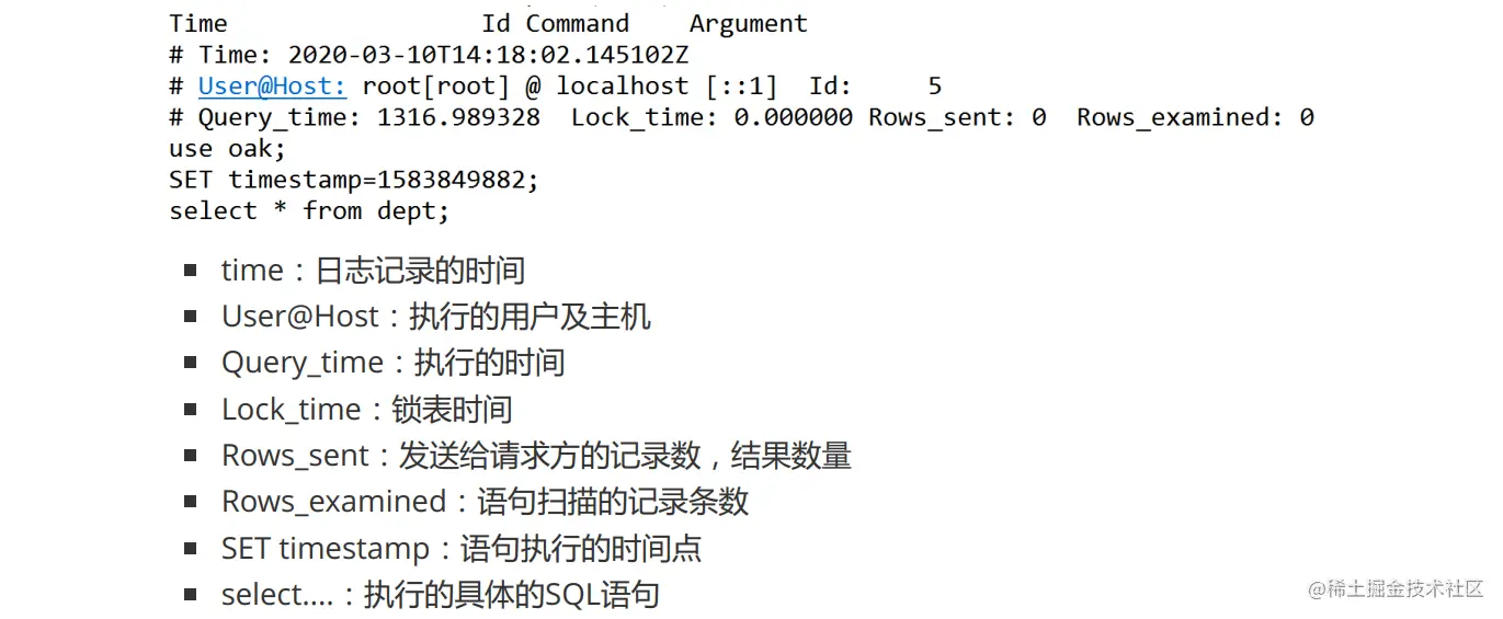 - 我们可以看到 SQL 的执行时间,与我们配置的 long_query_time 做比较,如果 SQL 的执行时间超过了这个阈值,则为慢查询