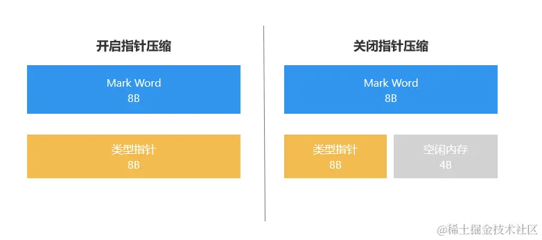 上面有段标红的文字:开启指针压缩占4B是指有效数据占4B,这块区域在内存中还是占8B。这里其实就是开启或关闭指针压缩的核心区别所在。
