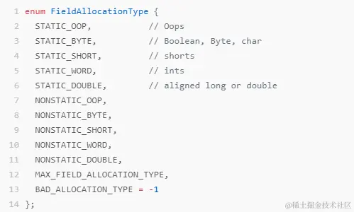 我们说大多数情况:64位机器,开启指针压缩,非数组对象,如果提前分配内存,目前只有实例数据这一块区域的大小是不确定的。这块也是最难确定的。hotspot是怎么做的呢?统计每种数据类型的大小,然后进行统一运算。上代码