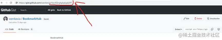 这时,在地址栏可以看到,URL的尾部就是Gist ID。用户名后面那串