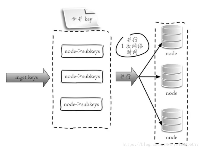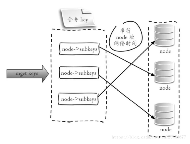 ②串行IO:Redis Cluster使用CRC16算法计算出散列值,再取对16383的余数就可以算出slot值,同时Smart客户端会保存slot和节点的对应关系,有了这两个数据就可以将属于同一个节点的key进行归档,得到每个节点的key子列表,之后对每个节点执行mget或者Pipeline操作,它的操作时间=node次网络时间+n次命令时间,网络次数是node的个数,整个过程如下图所示,很明显这种方案比第一种要好很多,但是如果节点数太多,还是有一定的性能问题。
