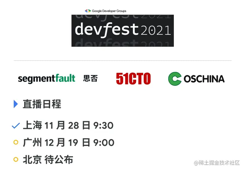 除了互动反馈,开发者活动也持续进行中!由谷歌开发者社区 (Google Developer Groups, GDG) 主导、深受开发者欢迎的 Google 技术交流系列活动 DevFest 已经于 11 月起,相继在全国 18 个城市持续开展,与开发者们分享前沿、多元的行业经验、视角和技能。除了 11 月 28 日在上海举办的 DevFest,思否、51CTO 和开源中国还将为大家带来北京、广州两场 DevFest 直播,敬请期待!点击这里 了解你所在城市的 DevFest 活动动态。