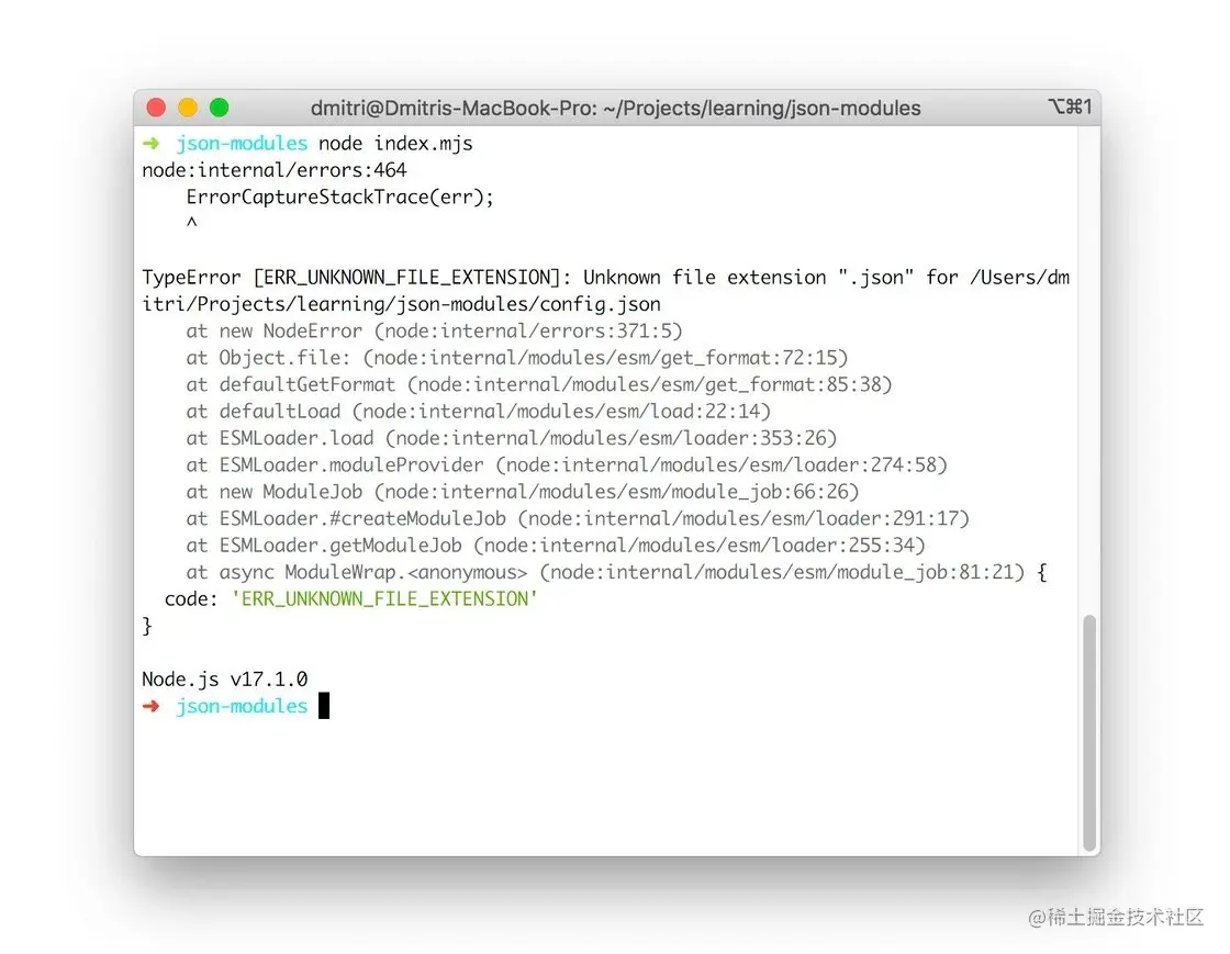 启动应用程序的时候,Node.js 抛出错误 TypeError [ERR_UNKNOWN_FILE_EXTENSION]: Unknown file extension ".json" 。