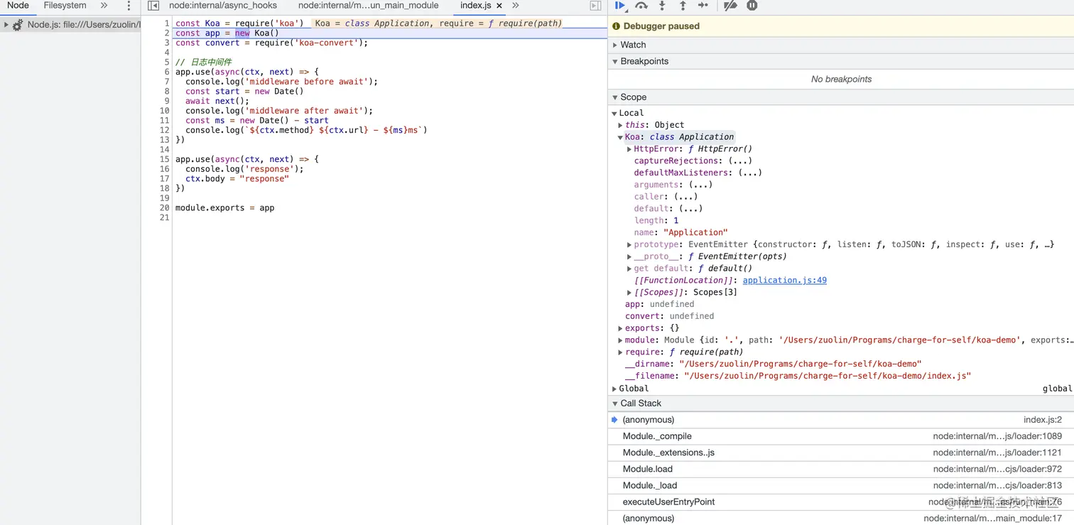 另外,为了更直观地梳理 koa 的运行原理和逻辑,还是通过调试来走一遍流程,本文将结合调试源码进行分析。